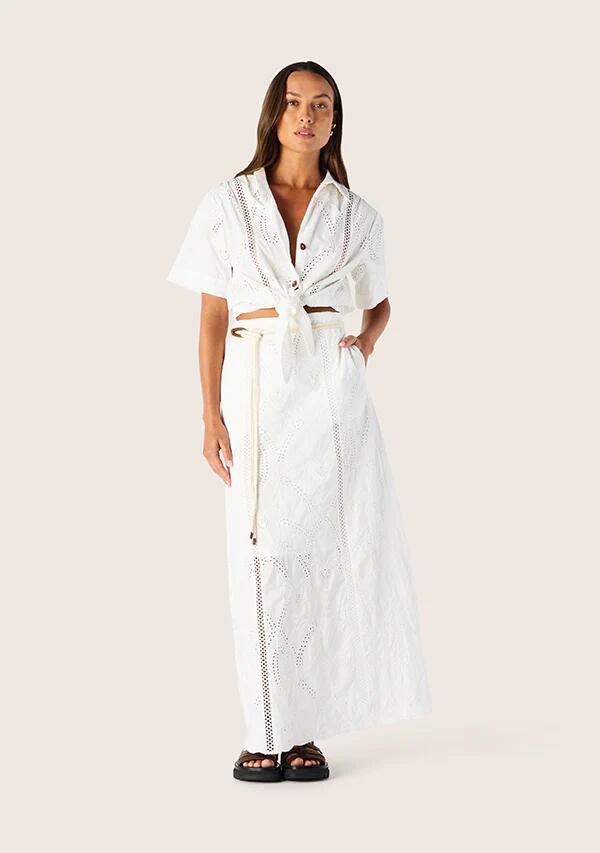 Embrace elevated bohemia with the Alicia Maxi Skirt, crafted from elegant embroidered cotton in white. The A-line silhouette fits high on the waist and falls to a full-length hem. Match it to the coordinating shirt, finishing the set with a detailed robe belt.Our eCommerce model, Fernanda, is 170cm tall with a 82cm bust, 62cm waist, 92cm hips, and wears a size 8.Features:– Cotton weave– High rise– Maxi silhouette– Back zip fastening– Embroidered details– Half lining– Detachable rope belt100% Cotton