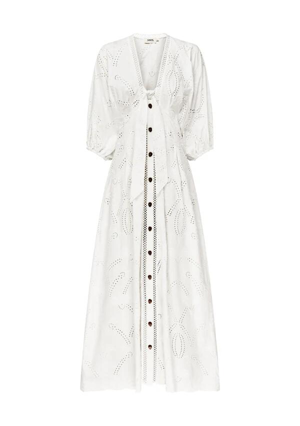 Cotton weave, V neckline, half sleeve, button-down closures, embroidered detail, midi hem | Shop Now, Buy Now Pay Later. Free Domestic Shipping over $300.