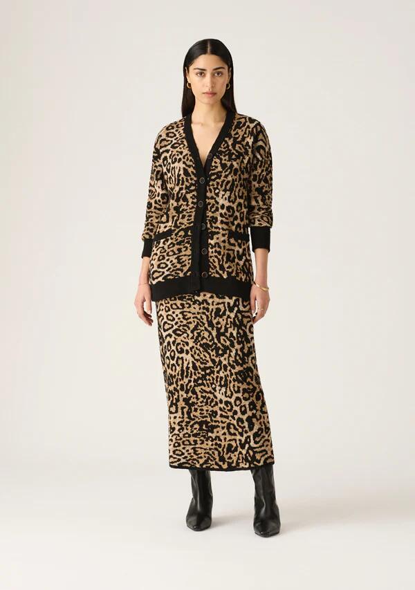 -Leopard print knit cardigan made from pure cotton-Accentuated by black rib at front opening, hem, cuffs and pockets-Open V-neckline set above contrast black button front-Slightly dropped shoulders enhance relaxed longline shaping