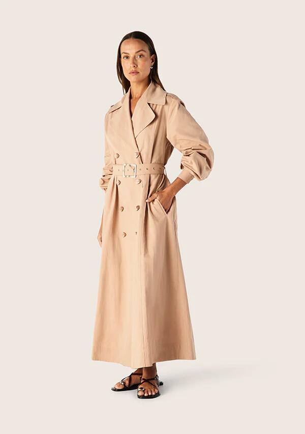 The definition of a transeasonal staple, the Arena Trench Coat is a piece that will stay in your wardrobe for years to come. Crafted from a mid-weight cotton-blend canvas in light pink, it fits with wide peaked lapels, balloon sleeves and an elegant A-line silhouette that falls to a maxi length. Double-breasted tonal shell buttons punctuate the body, while a buckled belt can be used to cinch the waist.Our eCommerce model, Fernanda, is 170cm tall with a 82cm bust, 62cm waist, 92cm hips, and wears a size 8.Features:- Cotton and tencel blend canvas- Wide peaked lapels- Balloon sleeves- A-line silhouette- Maxi hem- Double-breasted buttons- Detachable belt55% Cotton, 45% Tencel