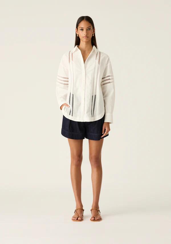 Feeling cool and crisp in a pure linen cotton blend, this long sleeve white shirt creates an effortless lightweight look, accentuated by mesh lace stripe detailing throughout. Enhancing its loose silhouette with a slim cami underneath, the shirt continues its appeal with a classic button-front below a sharp shirt collar, framed by dropped shoulders and voluminous cocoon sleeves.