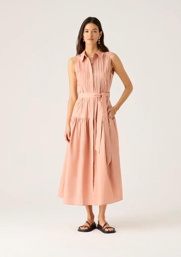 Accentuating this season’s pastel trend in our signature Mellow Peach, this sleeveless shirt dress delivers gorgeous lightweight shaping in a soft cotton blend. Revealing soft gathers through the flared midi skirt, the dress uses neat pleating to curve close to the hip, while completing the look with a concealed button front fastening and draped fabric belt that works to define the waist.