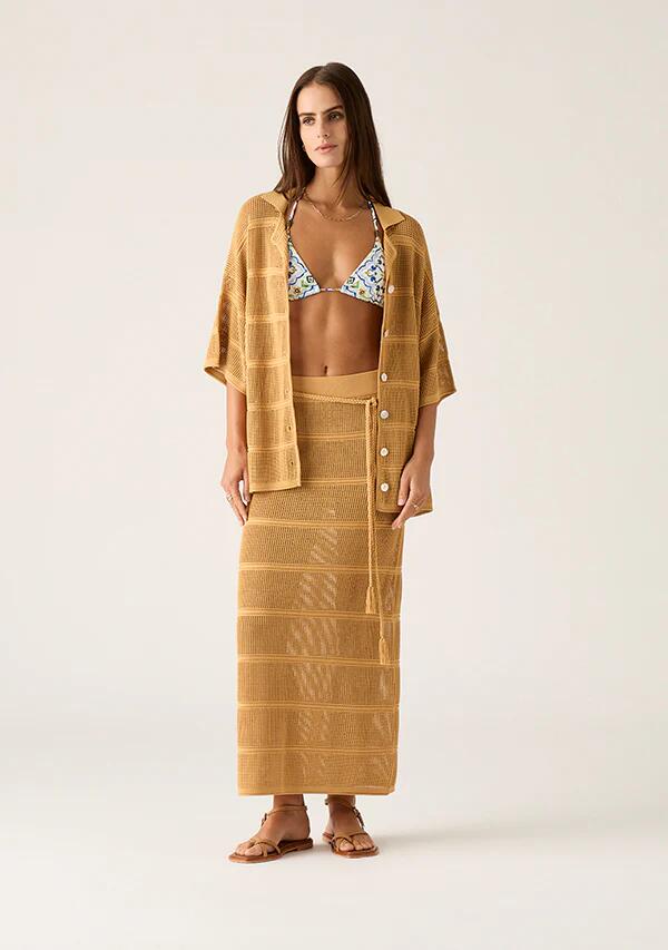 Taking you from beach to brunch, this knit maxi skirt looks beautiful in mustard yellow, as it shows off an open mesh-style knit, complemented by a solid horizontal stripe. Descending through flattering tube shaping at it descends to full length, the skirt offers a pull-on design featuring an elasticated waistband, which is accented by a plaited tie belt designed to drape to the knee.