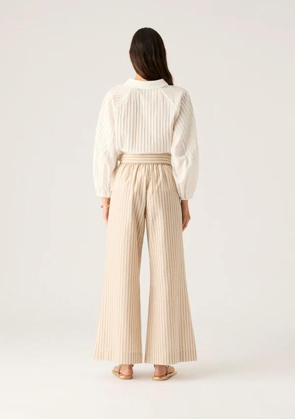 Flowing through a soft cotton blend, these pants extend through wide leg shaping to create a relaxed silhouette, complemented by a vertical stripe in sable and ivory. Creating effortless, lightweight appeal perfect for summer, the pants continue to impress with a fixed waistband up front and elasticated detailing at the back, completed by hip pockets and a self-tie belt.