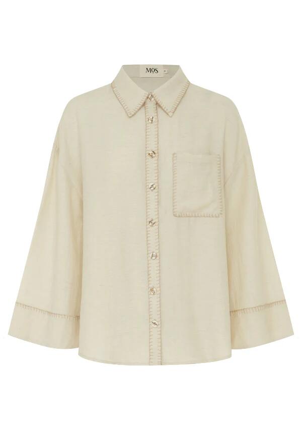 Sweeping over the skin to reveal loose, lightweight shaping, this long sleeve shirt feels cool and crisp in cream, accented by tonal feature stitching at the seams and chest patch pocket. Fastening with statement two-tone buttons at the classic front closure, the shirt further accents its oversized silhouette with a sharp shirt collar and broad kimono-style sleeves complete with wide cuffs.