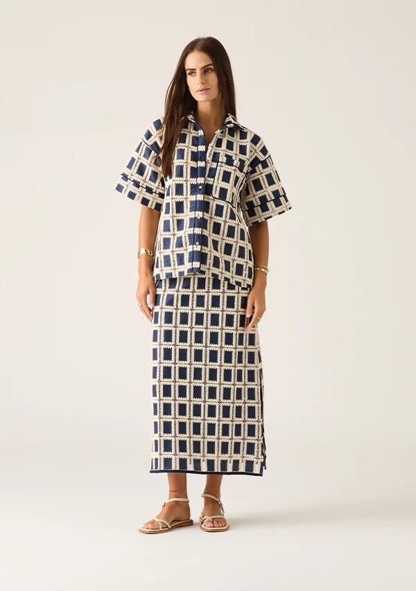 Relaxed in its shaping, this short sleeve shirt entices with a beautiful sense of texture, as it shows off an exclusive crochet tile design in ivory and navy. Fastening at the front with complementary tonal buttons, the shirt completes the look with navy piped detailing at the sharp shirt collar, dropped shoulders, broad cuffs and single patch pocket at the chest.