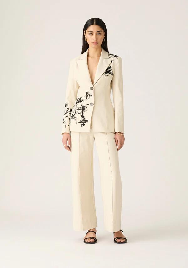 -Softly tailored blazer made from cotton and Tencel stretch suiting fabric-Crisp ivory base accentuated with intricate floral embroidery-Slim silhouette secured with statement double button front fastening-Further contrast buttons found at full length cuffs