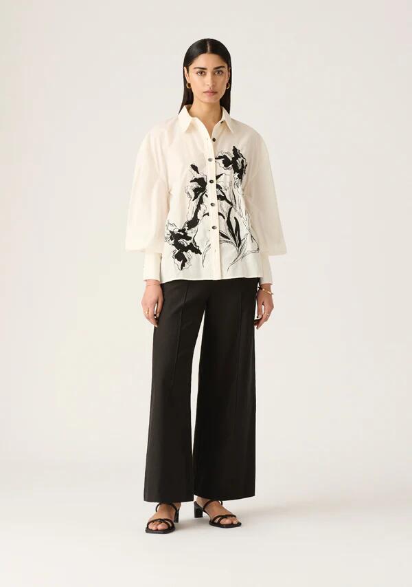 -Loose, lightweight blouse made from Tencel, cotton and linen blend-Ivory base featuring black embroidered floral detailing-Oval contrast buttons at the front fastening and cuffs-Exaggerated blouson sleeves with slim cuff and dropped shoulder
