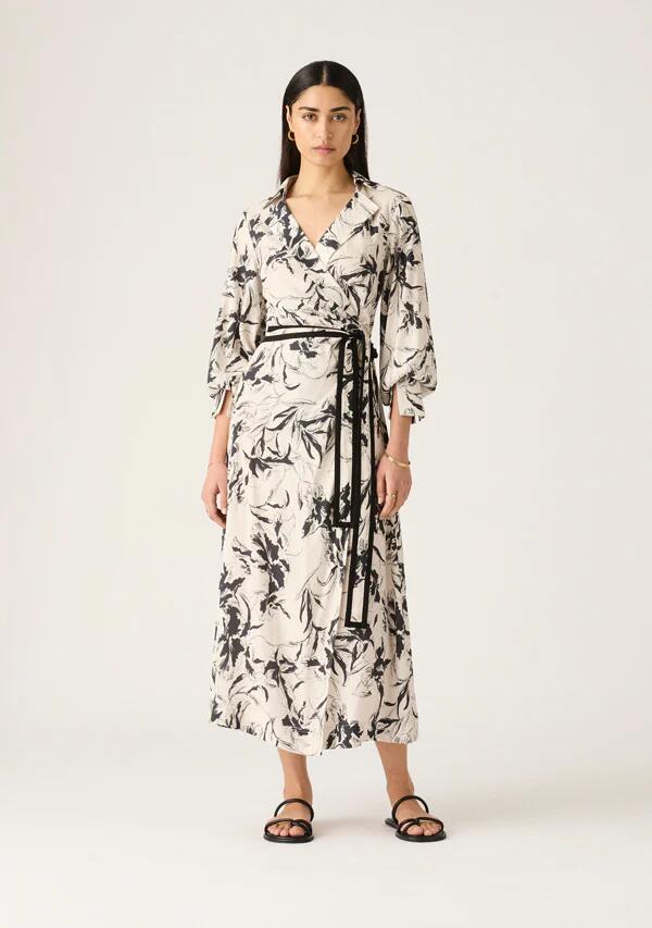Creating a relaxed sense of movement within its effortless wrap design, this dress sways to midi length within lightweight Tencel, flaunting a delicate floral print that sets black against ivory. Cinching the waist with a black-trimmed self-tie belt, the dress draws the eye up with an open V-neckline featuring a relaxed collar and lapel, framed by voluminous long blouson sleeves.