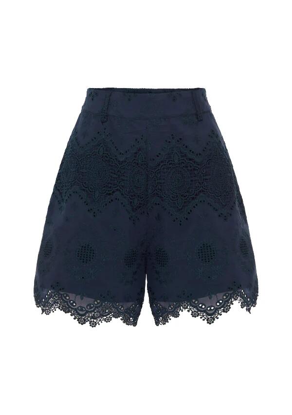 Revealing relaxed shaping through to mid-thigh, these navy shorts create a delicate sense of detail, as they reveal Victorian lace edged with feature lace detailing through the hem. Fastening discreetly at the side with an invisible zip, the fully lined shorts flare out from mid-rise through a slight A-line silhouette, which is complemented by belt loops at the waist and pockets at the hip.