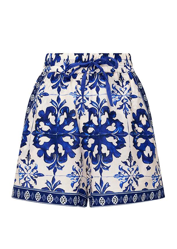 Creating an effortless, relaxed look elevated by our fabulous tile print, these shorts skim over the skin in a lightweight linen blend, falling to mid-thigh within a flowy A-line silhouette. Sitting comfortably at the waist with an elasticated waistband, the shorts offer up additional detail in a complementary blue waist tie at the front, framed by angled pockets at the hip.