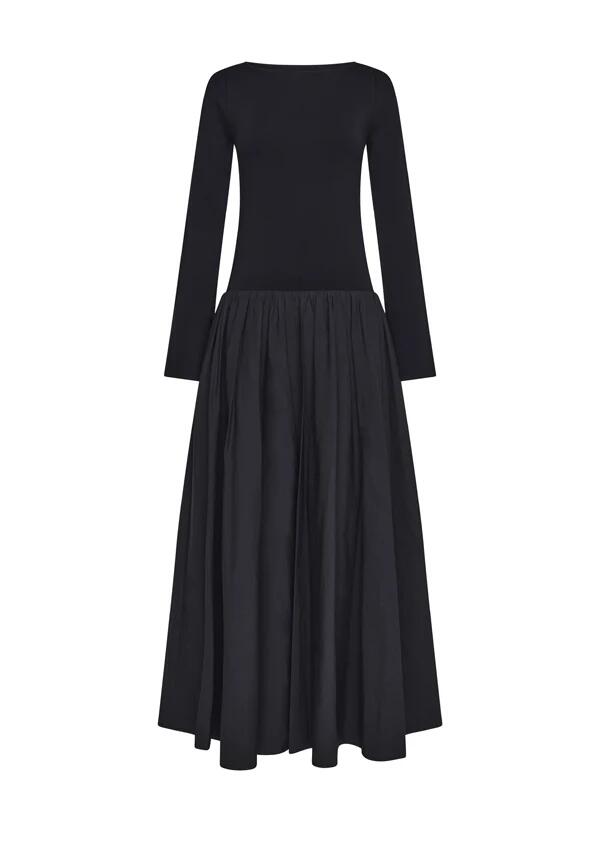 A cult classic in the making, the Nicolette Midi Dress is a beautiful play on textures. The design combines a soft, luxurious viscose top with a structured cotton skirt, creating depth and contrast within its all-black palette. Featuring a classic crew neckline, graceful bell sleeves and a drop waist that falls into a gathered skirt seam, this dress brings an understated elegance to any setting.Our eCommerce model, Christina, is 178cm tall with a 78cm bust, 62cm waist, 89cm hips, and wears a size S/8.Features:-Crew neckline-Bell sleeves-Drop waist design-Gathered skirt seam-Full volume skirt-Top: 75% Viscose; 25% Nylon-Bottom: 72% Cotton; 35% Nylon