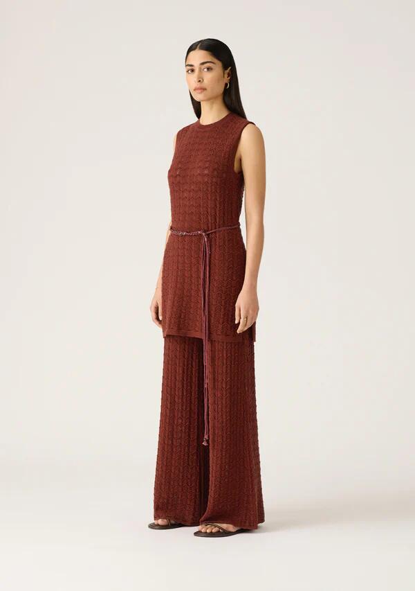 -Wide leg knit pants in an earthy, rich wine colouring-Soft-touch knit showcases textured chevron design-Elasticated waistband at mid-rise offers an easy pull-on style-Clean lines at waist through to relaxed leg